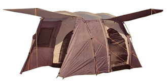 В данной модели вместительный высокий тамбур, где можно поставить небольшой стол и кресло или сложить в нем свое снаряжения. При необходимости входы можно закрыть тентом на молнию и липучки, в таком сборе палатка полностью водонепроницаема и защитит Вас от сильного дождя и ветра. Палатка двухслойная: состоит из внешнего тента и внутренней палатки. Плотный не продуваемый материал. Удобный и надежный механизм сборки/разборки. В комплекте стойки для навеса, ветровые оттяжки, колышки. Все швы надежно проклеены. Палатка в упаковочной сумке с ручками. Общая длина - 430 см.